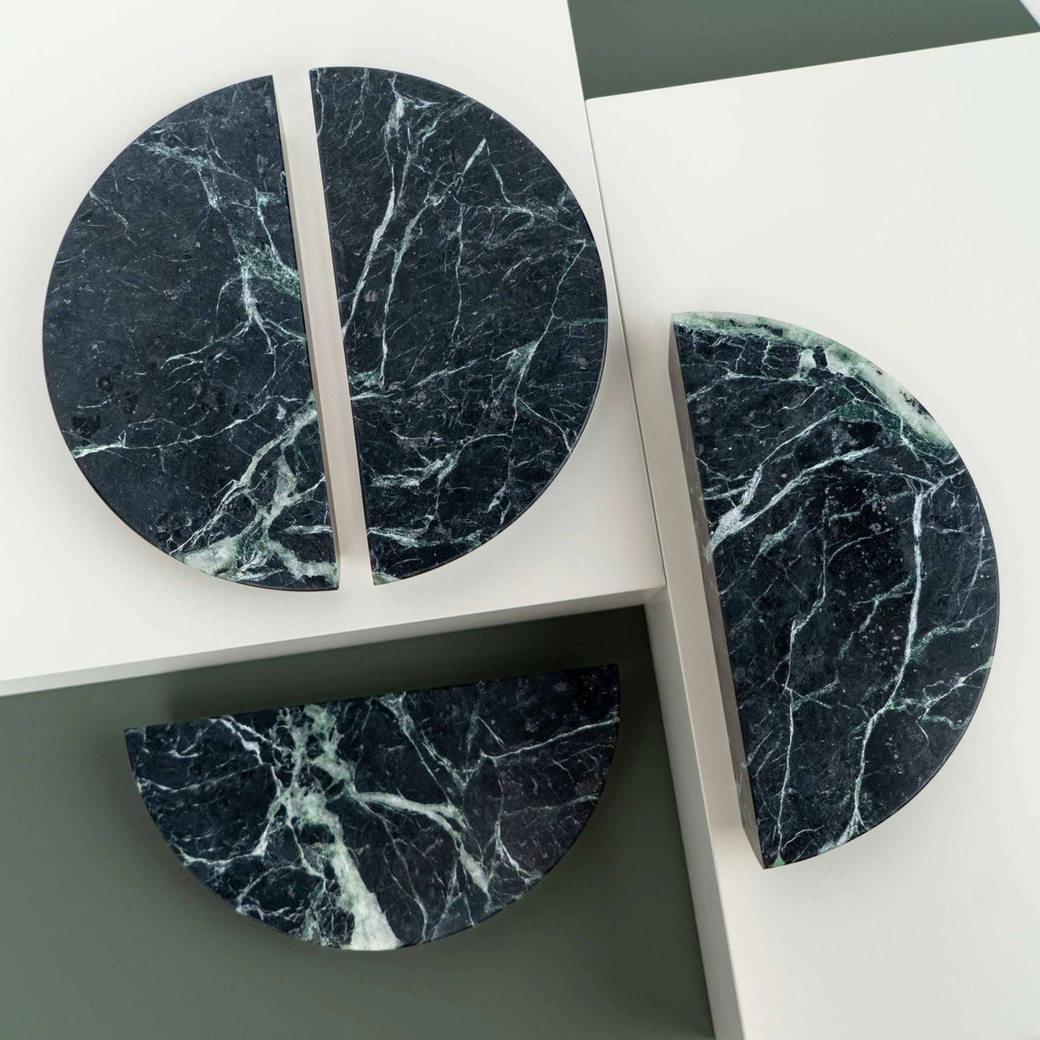 Giv dine skabe eller møbler et distinkt udtryk med dette greb i eksklusiv Green Flower-marmor – en natursten kendt for sine levende årer i grøn og hvid. Hvert grebpar er unikt, hvor mønster og farvenuancer varierer på en måde, som kun ægte sten kan tilbyde. Grebene er udskåret af ét helt stykke sten, så årerne passer sammen. De har en finpudset overflade med en silkemat finish. Grebets halvmåneform giver et skulpturelt udtryk med både visuel balance og praktisk funktion.