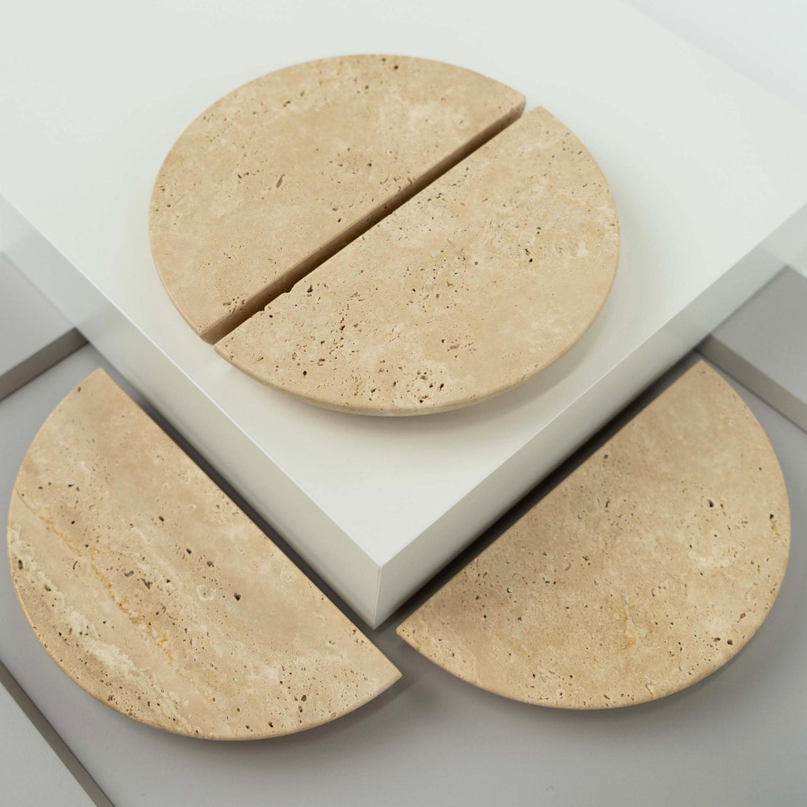 Giv dine skabe eller møbler et markant og tidløst udtryk med dette halvmåneformede greb i eksklusiv travertin – en klassisk natursten kendt for sine varme toner, naturlige porer og bløde struktur. Hvert greb er et unikt stykke natur, hvor mønstre, teksturer og farvenuancer varierer organisk og skaber en levende fornemmelse, som kun ægte sten kan give. Grebene er finpudsede og har en silkemat overflade.