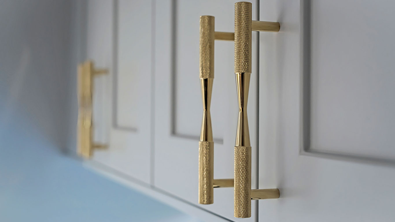 Guldplateret, stilrent greb i solid messing med nubret mønster og elegant konisk mellemstykke. Dette greb er designet til at give dit køkken, badeværelse eller stue et unikt og eksklusivt udtryk. Perfekt som en iøjnefaldende indretningsdetalje,... Læs mere