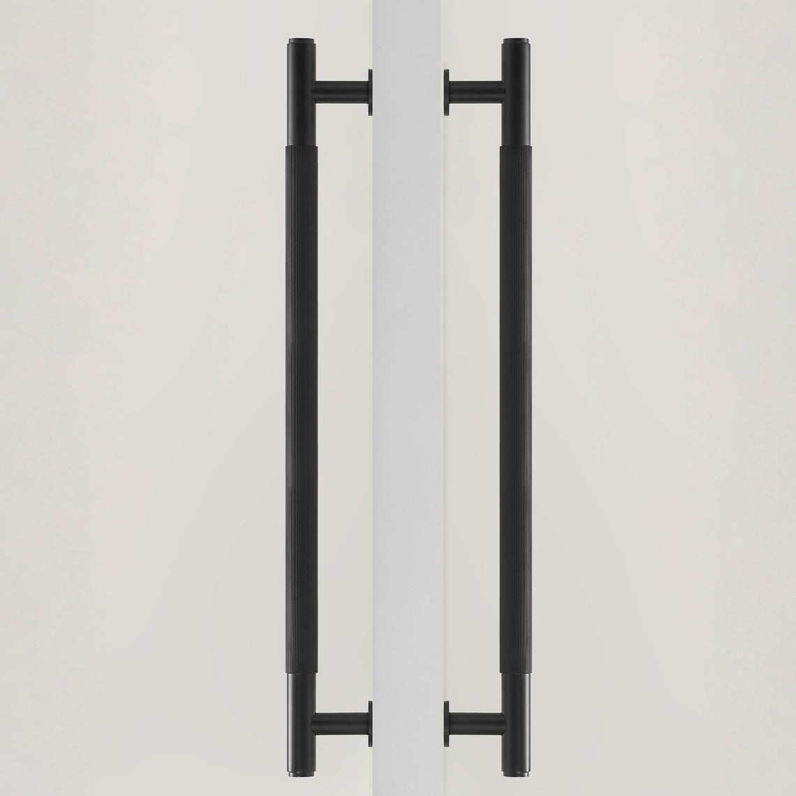 Black pull bar in solid brass with a ribbed surface. A modern and robust handle suitable as a handle for shower walls, wardrobes, or similar applications where access from both sides is required. Its substantial weight combined with the ribbed details does not go unnoticed. A premium handle for those who value intricate detail and quality. The handle is made of solid brass and comes as a set of two with fittings for installation in glass doors, wooden doors, or panels with a thickness of 35-55 mm.
