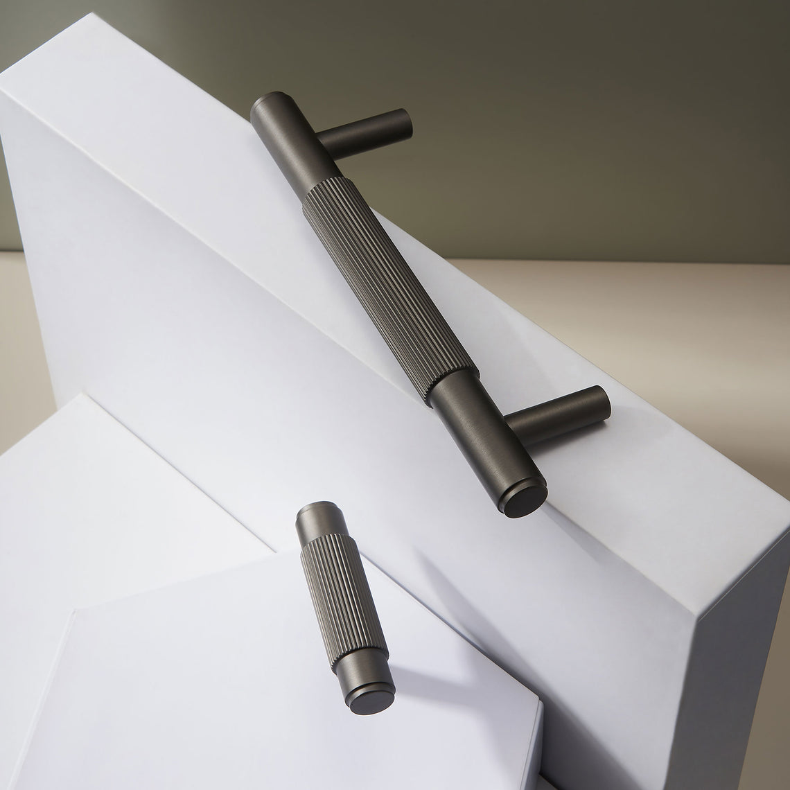 Maniglia nera in ottone massiccio con superficie zigrinata. Un modello moderno e uno dei nostri bestseller assoluti in negozio. Perfetta sia per le ante della cucina che per il mobile del bagno o altri arredi. Il suo peso solido, combinato con i dettagli zigrinati, non passa inosservato. Una maniglia premium per chi apprezza la cura dei dettagli e la qualità.