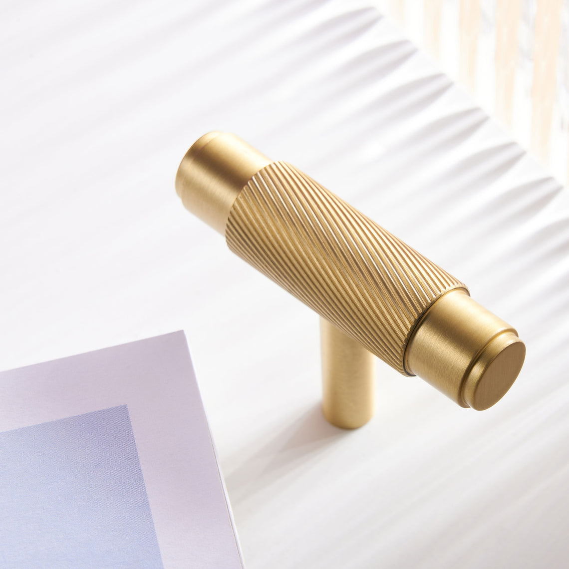 Barra a T in ottone massiccio con superficie zigrinata. Perfetta per ante da cucina, mobiletti da bagno o mobili. La sua solidità, unita ai dettagli zigrinati, conferisce un aspetto esclusivo che non passa inosservato. Realizzata in ottone massiccio, trattata con un rivestimento protettivo per una finitura impeccabile e una superficie durevole.
