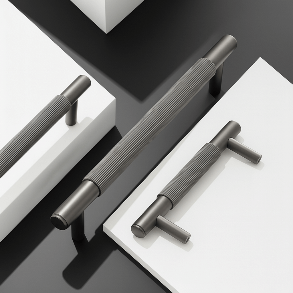Grijze deurkruk van massief messing met gekarteld oppervlak. Een moderne handgreep en één van onze absolute bestsellers in de winkel. Geschikt voor keukendeuren, maar ook voor ladekasten of meubels in de badkamer. Het stevige gewicht in combinatie met de geribbelde details blijft niet onopgemerkt. Een premium handgreep voor degenen die waarde hechten aan details en kwaliteit.