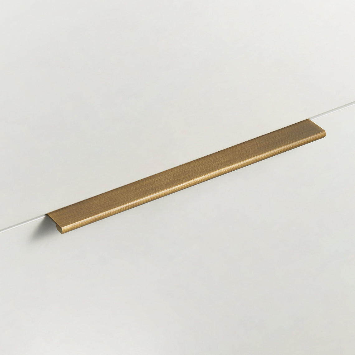 Mässinghandtag i profil med borstad finish. Stilren och modern utformning, passar likväl till köksluckorna som till den modernare hallmöbeln. Med en smart infästning på baksidan av luckan behövs ingen genomborrning, vilket inte bara bevarar luckans originalyta utan möjliggör även framtida handtagsbyten utan synliga hål. Den borstade finishen tillför en exklusiv touch och bidrar till en långvarig, sofistikerad stil i hemmet.